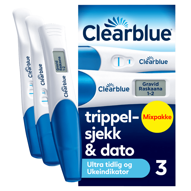 - 1 pk. Clearblue Triple Check & Dato (2 stk. Clearblue Ultra Tidlig Graviditetstest + 1 stk. Clearblue Digital Graviditetstest med Ukeindikator)