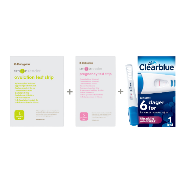 Få maksimal kontroll og tidlige svar med dette komplette fertilitetssettet. Du får både den nyeste testteknologien fra Clearblue og smart syklussporing fra Smile Reader.